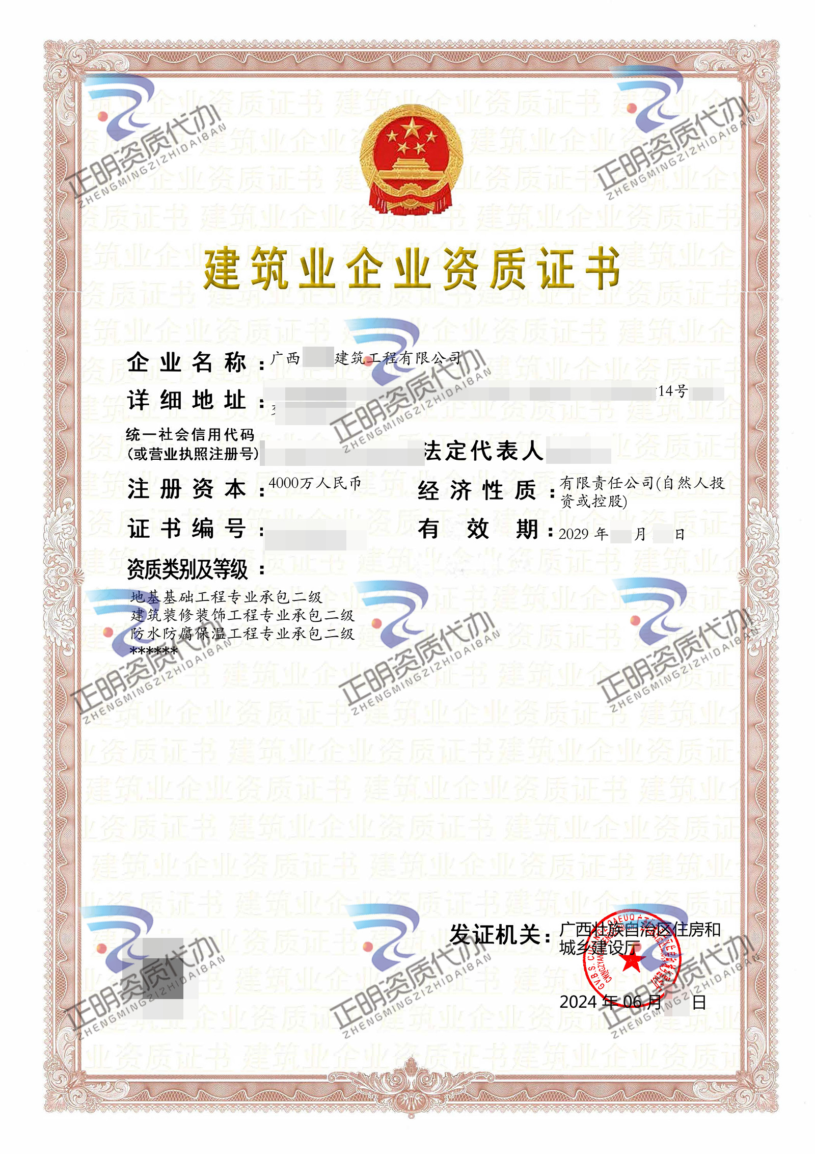 廣西****有限公司的謝總,是我們公司的老客戶了,所有的資質(zhì)都是在我公司辦理,還介紹朋友過來跟我們公司合作,這次也成功的幫謝總公司辦理了防水防腐保溫工程專業(yè)承包二級、建筑裝修裝飾工程專業(yè)承包二級等資質(zhì)。